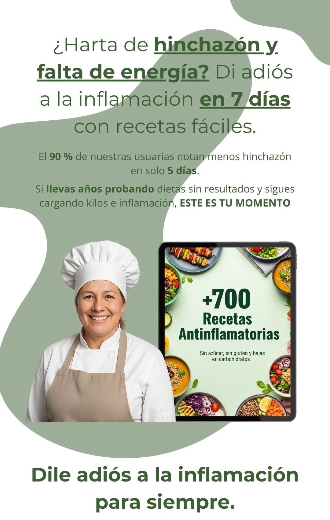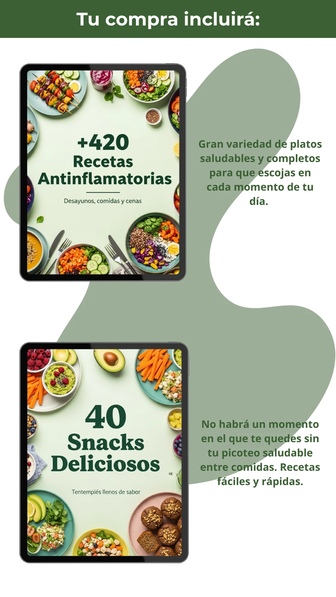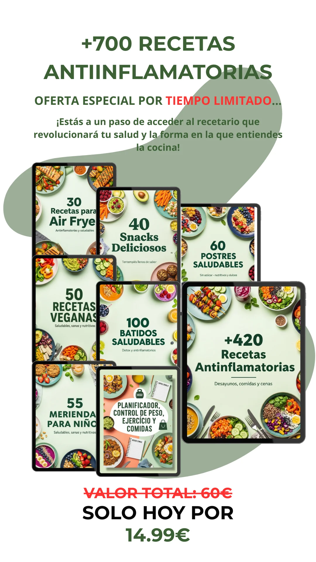 Acceso a 700+ recetas antiinflamatorias sin gluten ni azúcar añadido, con fotos paso a paso, listas de compra, tiempos orientativos y batch cooking. Pago único de €14,99, acceso de por vida y actualizaciones mensuales GRATIS. Entrega digital inmediata por email tras la compra.